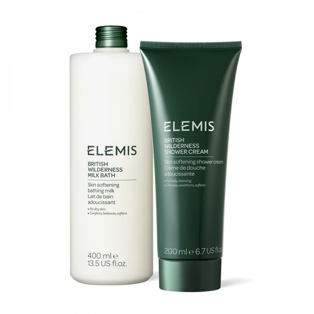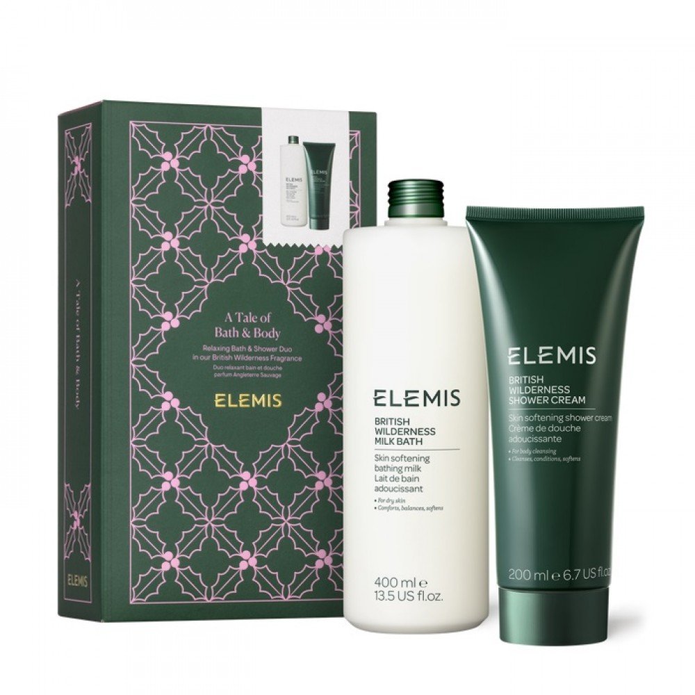 Подарунковий розслаблюючий набір для ванни та душу: молочко та крем-гель з ароматом дерева пачулі та амбри Elemis A Tale Of Bath Body British Wilderness