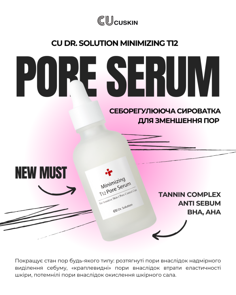 Себорегулююча сироватка для зменшення пор з Tannin Complex, Anti-Sebum P (гліколева, саліцилова кислота, екстракт кави, винограду, каштану) CUSKIN Dr.Solution Minimizimg T12 Pore Serum 50ml